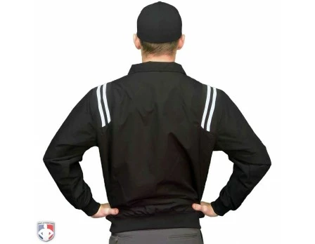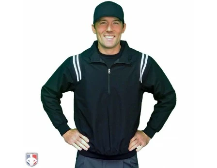 This is the traditional black half-zip baseball and softball umpire jacket (pullover) made for chilly to cold weather with traditional white stripes over the shoulders.
